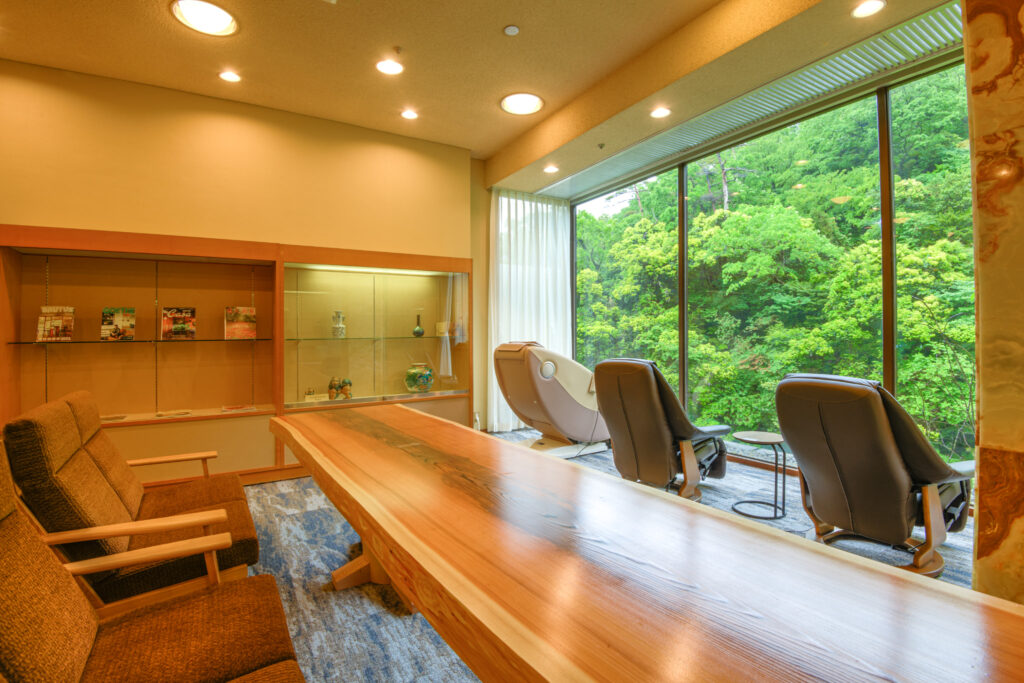 露天風呂付特別室のお客様向けに、お部屋以外でもお寛ぎいただける専用ラウンジもございます。 ・ジュースやコーヒー等が楽しめる “フリードリンクスペース” ・ゆっくりと読書ができる “ライブラリー” ・鶴仙渓を眺望しながらほっと一息 “リクライニングチェア” 等 ※専用ラウンジは、2023年・2025年オープン “露天風呂付客室3タイプ”のご宿泊者様のみ、ご利用いただけます。 2022年オープン “源泉半露天風呂付き特別和洋室” ご利用のお客様は対象外となります。 予めご了承くださいませ。